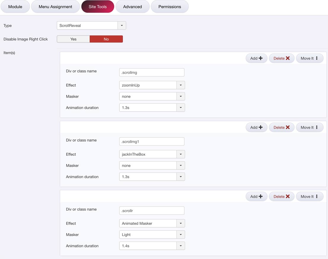 - 3- In module settings go in "Site Tools" tab and there in Type select "Scrollreveal". In "Div or class name" add the code.
