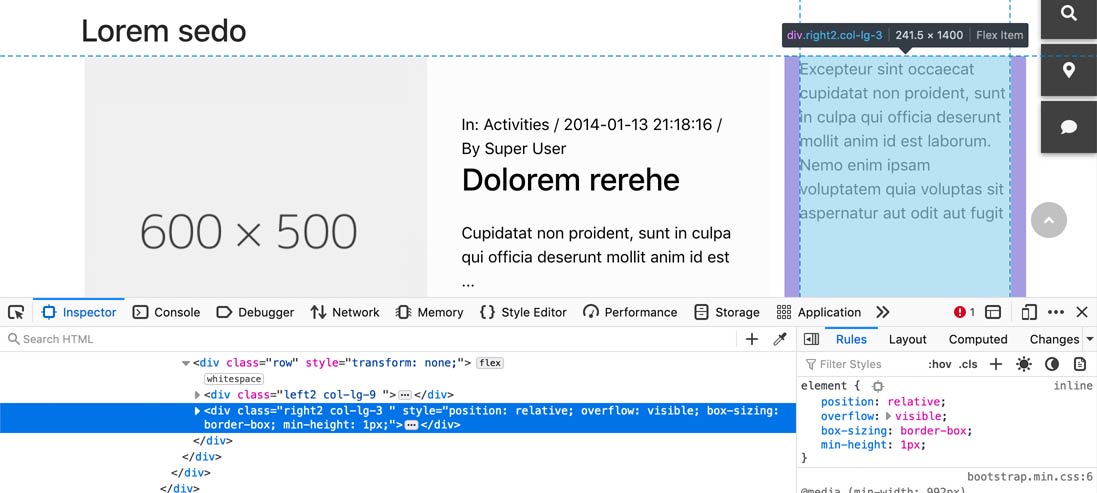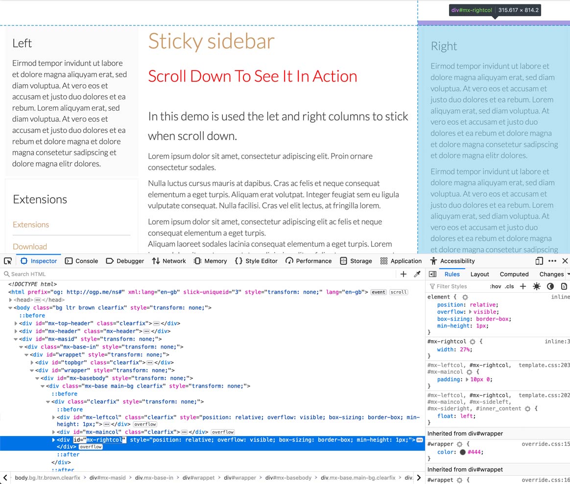 On the next image we are checking the code of right column which is mx-rightcol. Again is a div with id, so it should be the code #mx-rightcol