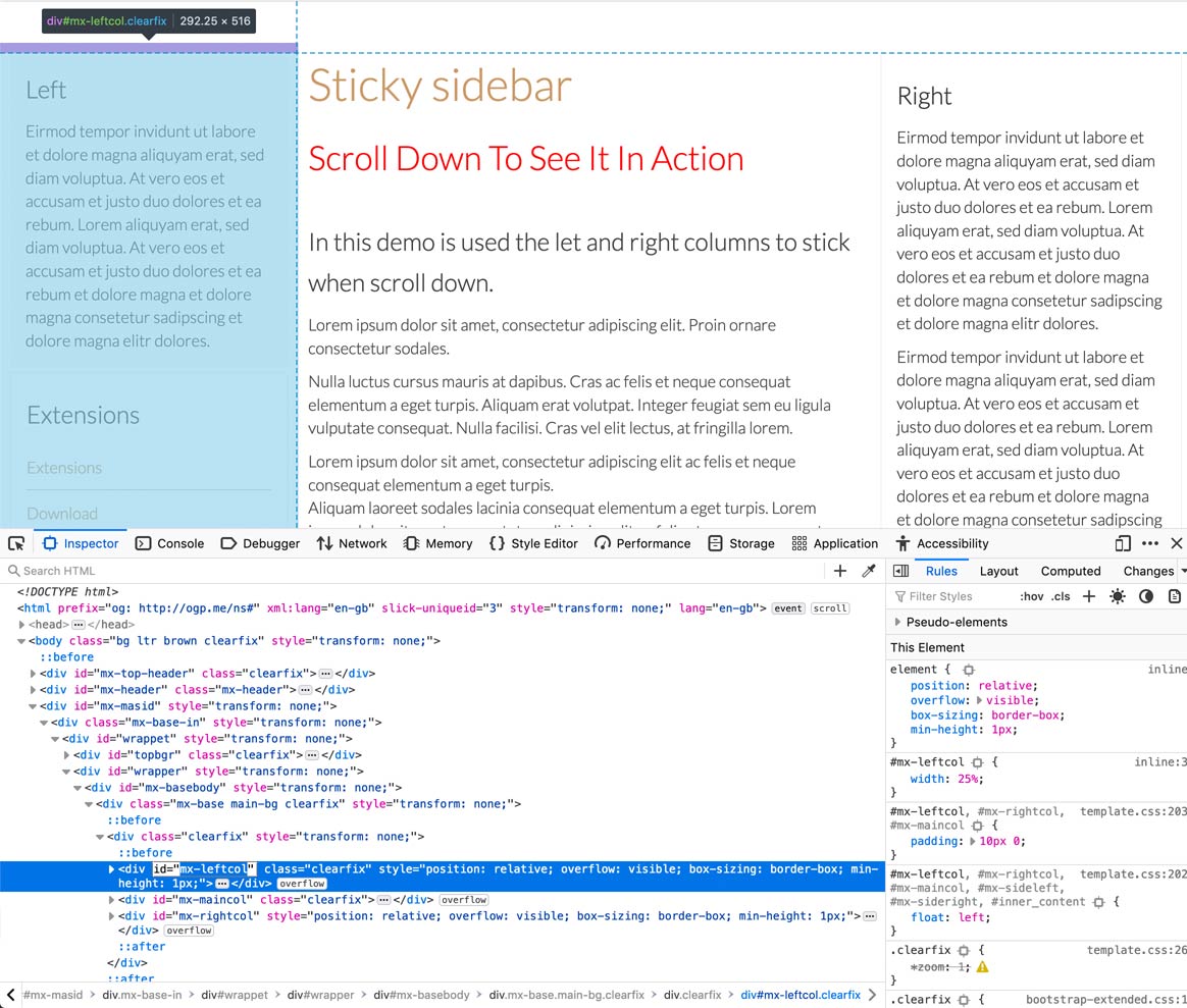 On the image below, we are checking the code left column which is mx-leftcol. In this case is a div with id, so it should be the code #mx-leftcol