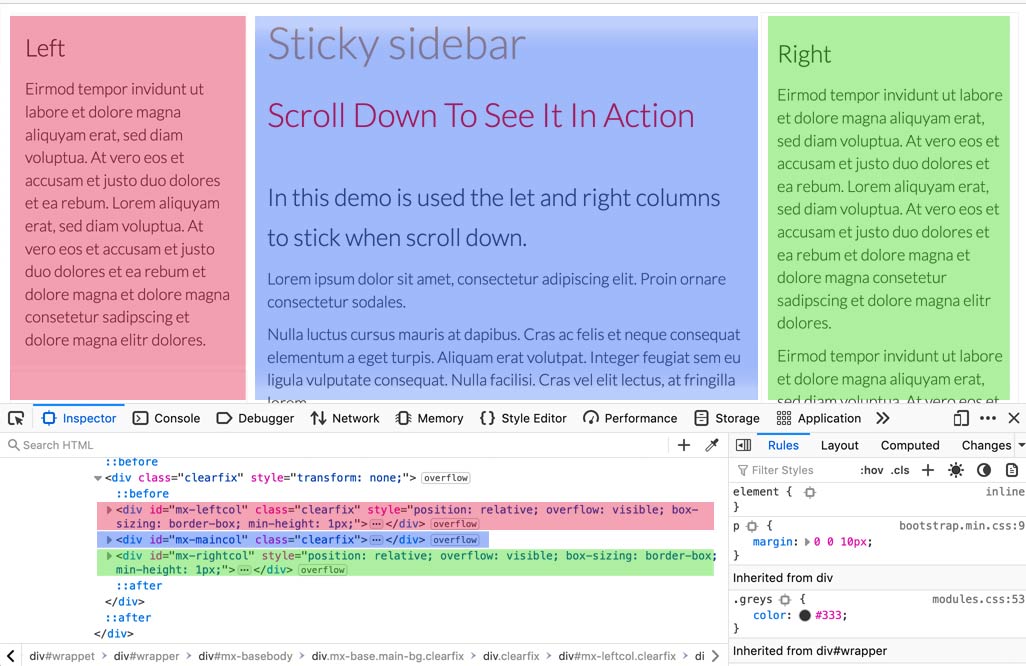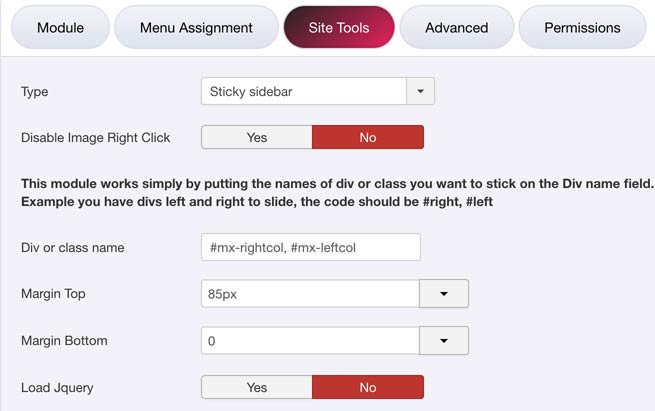 - 3- In module settings go in "Site Tools" tab and there in Type select "Sticky Sidebar". In "Div or class name" add the names. So for the codes which are in our example, it should be #mx-leftcol, #mx-rightcol Sticky sidebar documentation. As there are more than one columns, it should be separate by ,