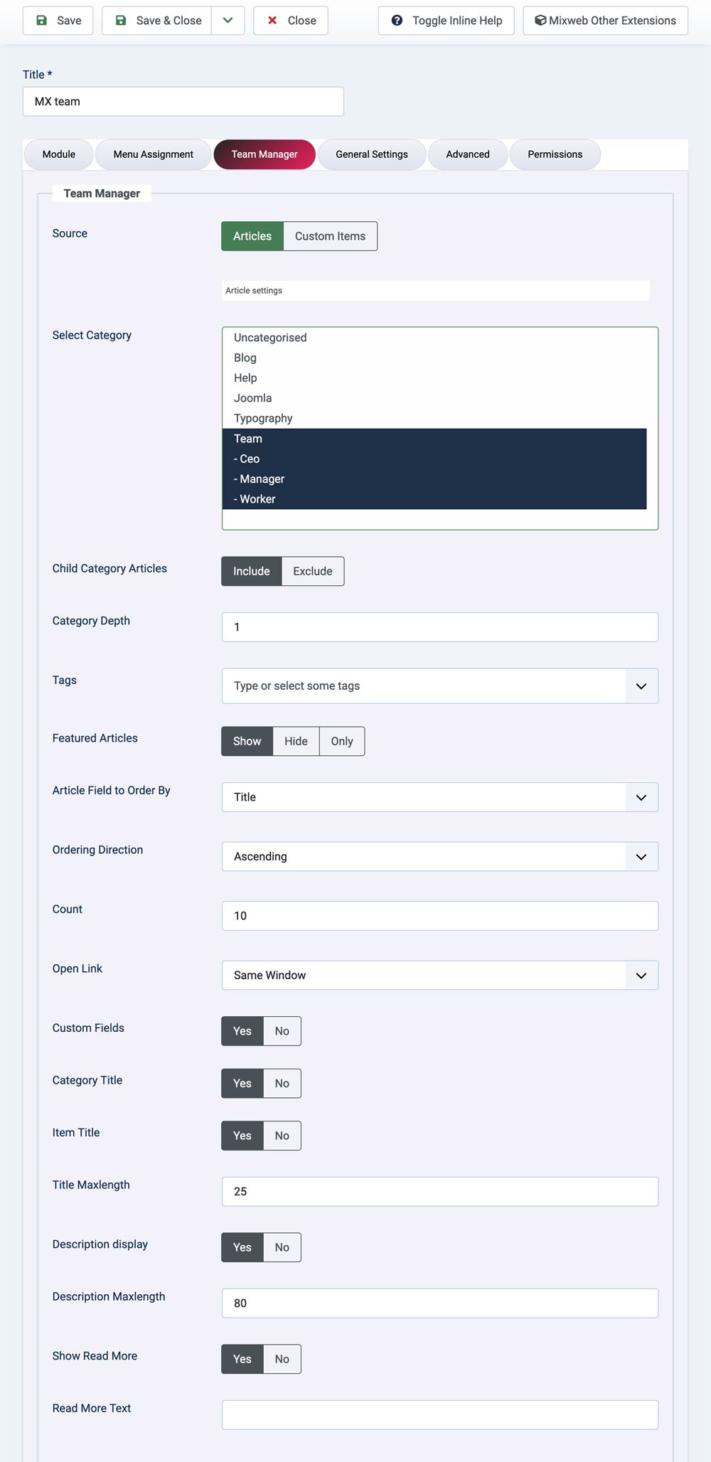 In this documentation is explained how to use team module. The module has two options: to create custom items or load joomla content.