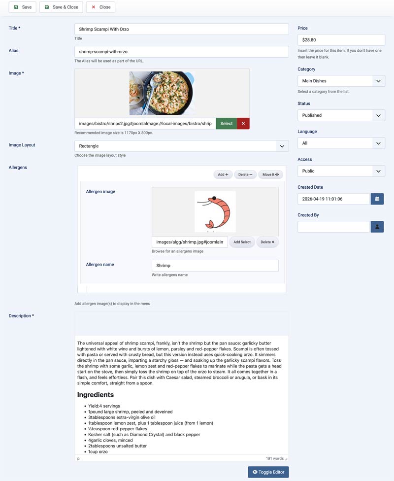 - Allergens: (Optional) Add allergen images and the title using the subform (add/remove/move buttons). Unlimited Allergens.